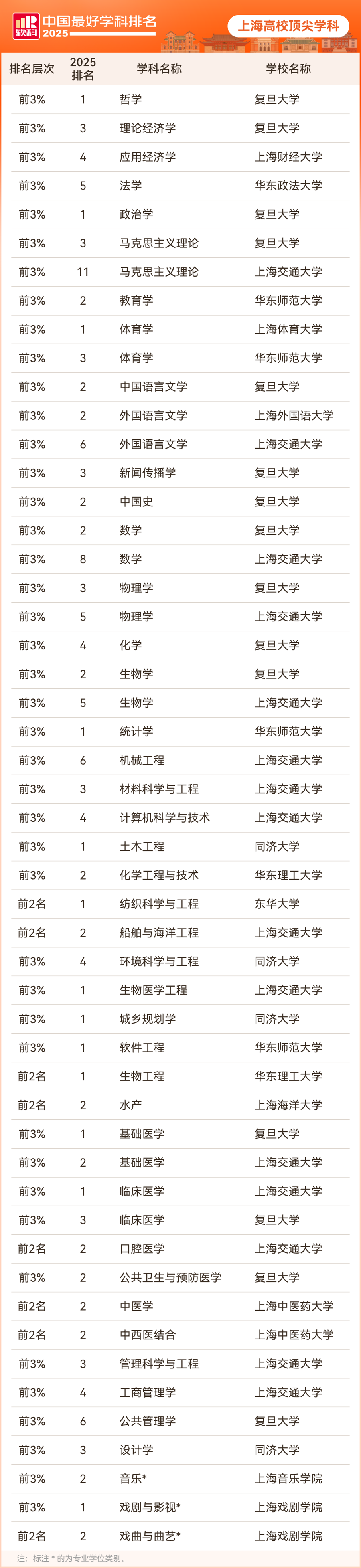 在中国顶尖学科(含一级学科和专业学位类别)分布上,上海市共拥有51个顶尖学科,其中复旦大学15个,哲学、政治学、基础医学3个学科排名全国第一;上海交通大学拥有15个,其中临床医学和生物医学工程2个学科排名全国第一;华东师范大学和同济大学均拥有4个顶尖学科,华东师范大学的统计学和软件工程、同济大学的土木工程和城乡规划学均位居全国第一。此外华东理工大学、上海戏剧学院、上海中医药大学各拥有2个顶尖学科;东华大学、华东政法大学、上海财经大学、上海海洋大学、上海体育大学、上海外国语大学、上海音乐学院各拥有1个顶尖学科;其中,华东理工大学的生物工程、上海戏剧学院的戏剧与影视、东华大学的纺织科学与工程、上海体育大学的体育学均为全国冠军学科。